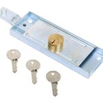 Serratura per basculanti, apertura esterna con chiave ed interna con leva di sbloccaggio. Cilindro tondo mm.25 a 3 pistoncini (1 antimanipolazione). Sporgenza cilindro mm.5,5, sporgenza del catenaccio mm.24 e corsa mm.24. Fornita con 3 chiavi in ottone nichelato
